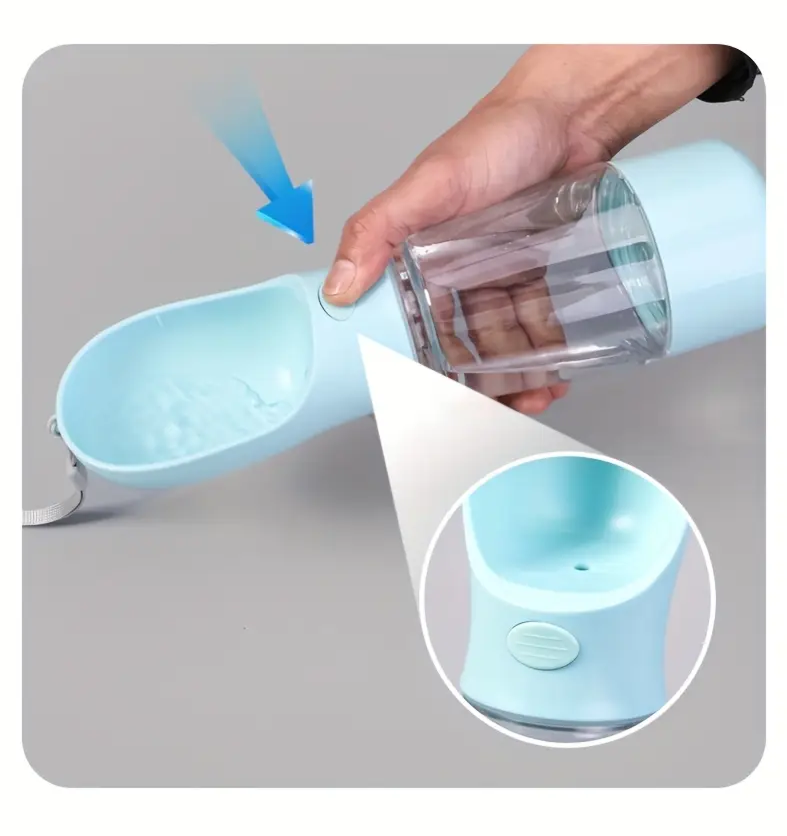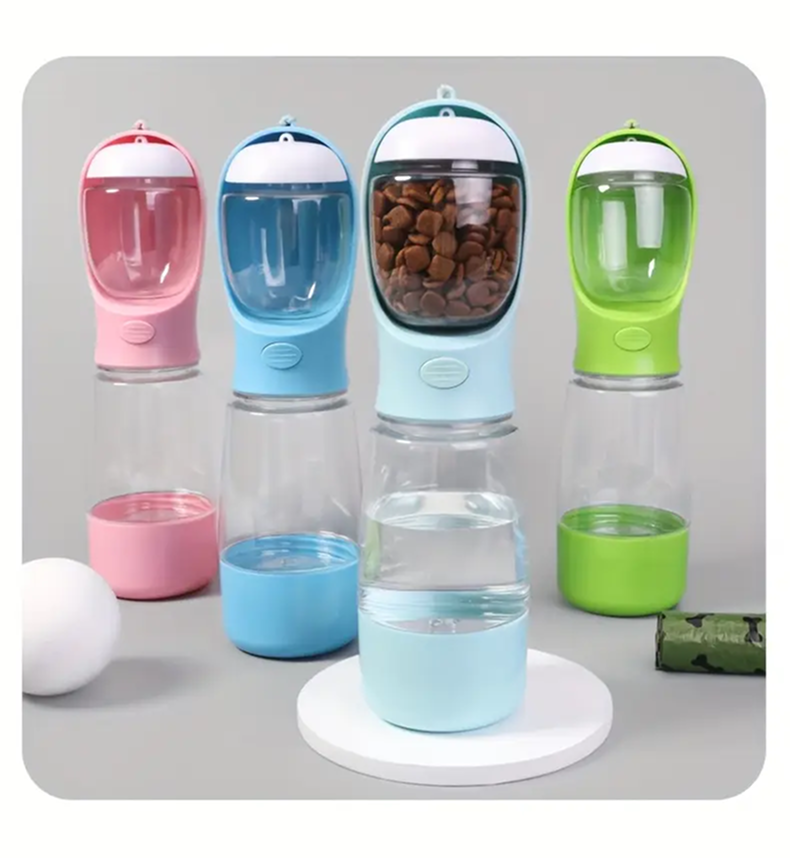 Todo lo que tu mascota necesita en un solo accesorio. Esta botella portátil para mascotas incluye dispensador de agua (400 ml), compartimiento de comida (150 ml), dispensador de bolsas para paseos más cómodos, higiénicos y seguros. Compacta, ligera y fabricada con materiales eco-friendly certificados (BPA Free, FDA, Lead Free), perfecta para cuidar de tu mascota y del medio ambiente en cada salida.